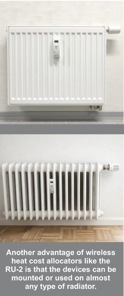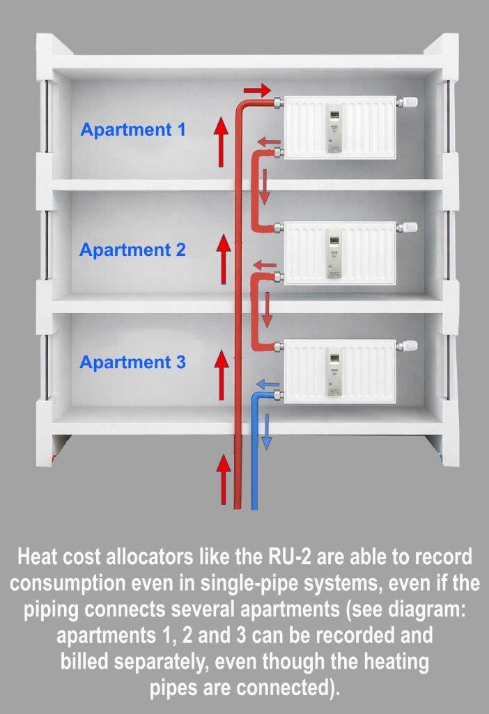 Heat cost allocators can be used even when the heating pipes run through several apartments. In such cases, the use of heat meters is not possible because heat meters require a clearly defined, closed heating circuit for each residential unit, in which the entire flow and return temperature as well as the flow rate can be measured.